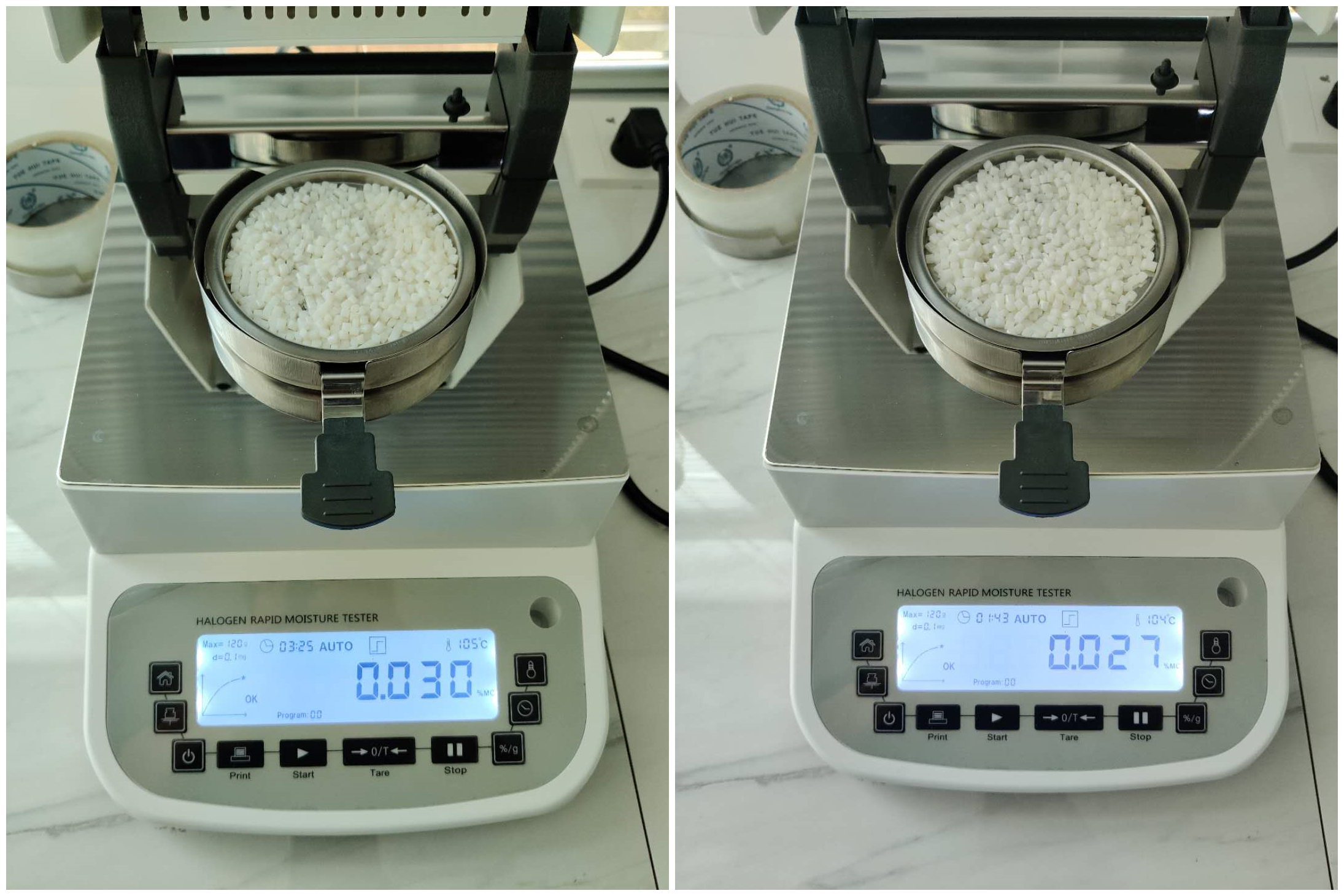 - 復(fù)位儀器,待儀器冷卻至40℃以下后,再取15g左右烘干的顆粒均勻鋪在樣品盤上,重復(fù)上述測試步驟;測試結(jié)束后得出第二組數(shù)據(jù),顯示樣品的水分含量為0.027%;數(shù)據(jù)基本相同誤差僅為0.003%,表示測試結(jié)果可靠,可重復(fù)性好。